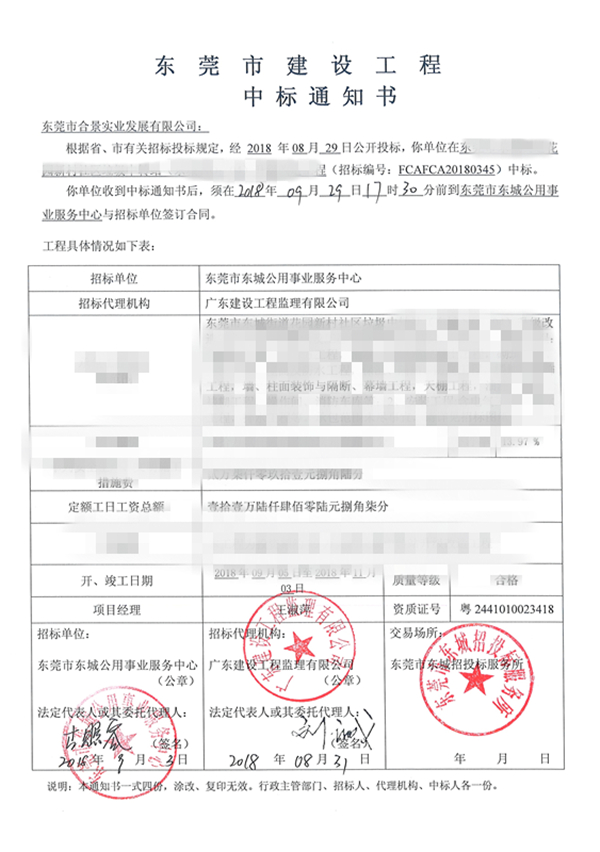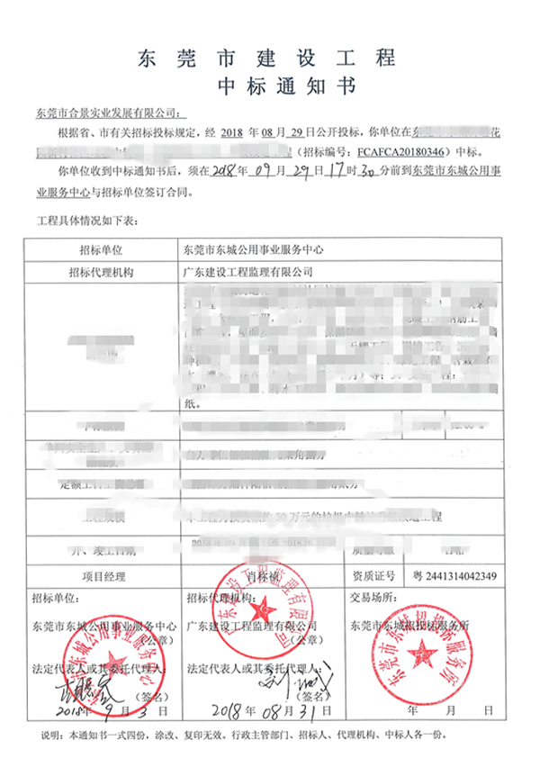 2018年8月29日,喜讯频传,东莞市合景实业发展有限公司在八月底的这一天成为东莞市政市场上的幸运儿,上下午连续中标东莞市东城街道市政升级改造项目四号五号段工程,收获颇丰。今天,公司收到中标通知书,已顺利完成签约。