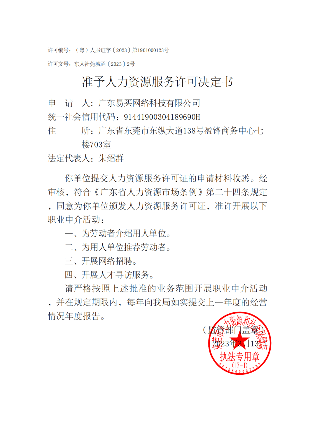 近日,广东易买网络科技有限公司顺利通过广东省人力资源行政部门审批,批准同意开展人力资源服务工作,并获东莞市人力资源和社会保障局颁发的《人力资源服务许可证》。