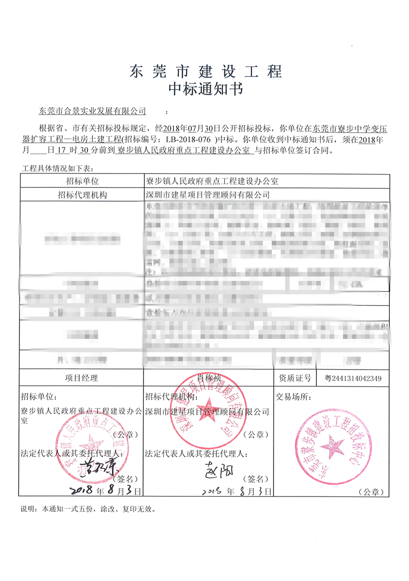 2018年7月30日,东莞市政市场传来喜讯,东莞市合景实业发展有限公司中标东莞市政项目寮步土建工程。目前,公司已收到中标通知书,并完成了项目签约。
