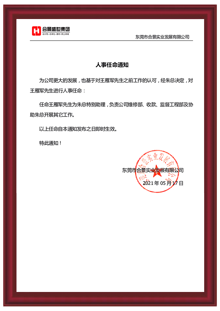 为推动公司更大发展,经公司综合评估,王雁军先生将担任朱总特别助理,负责公司维修部、收款、监理部及协助总经理开展其他工作。