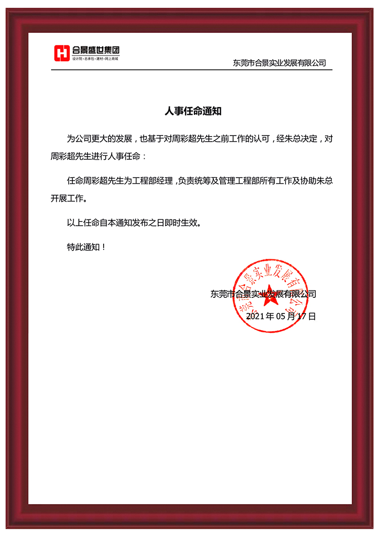 任命周彩超先生为工程部经理,负责统筹及管理工程部所有工作及协助总经理开展其他工作。