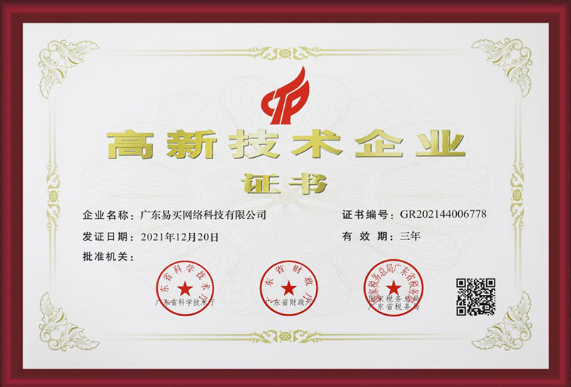 国家高新技术企业是由科技部、财政部、国家税务总局三大部委共同认定,依据有关规定,对企业拥有的自主知识产权、研发投入、研发团队建设、高新产品收入、组织管理能力、成长能力等综合能力进行全方位权重考评,是企业科研实力及科研水平的有力证明,也是目前国内对企业在科技综合实力方面最权威的评价之一。易买建材产业互联网平台能获此殊荣,背后体现的是易买建材对产业供应链互联网化降本增效做出突出贡献的肯定。