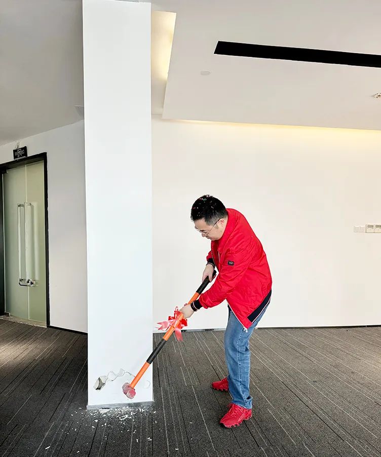 红桌、红锤、红毯,色泽鲜亮红润的乳猪,红红火火!一锤开工大吉,二锤财源广进,三锤万事如意!伴随着礼花的绽放,合景人手握礼锤,一同为新办公区装修开工仪式揭开序幕。在热烈的掌声中,大家共同庆祝办公楼装修工程的正式启动!